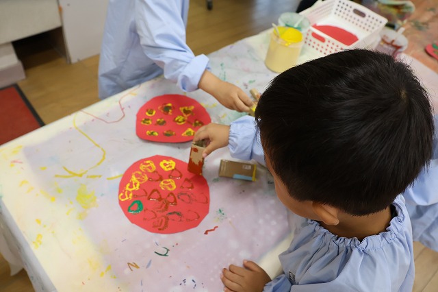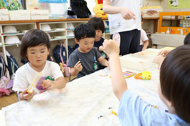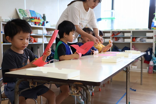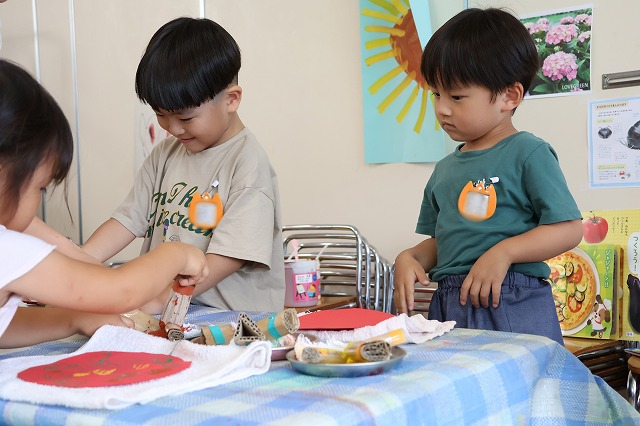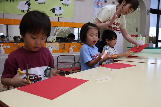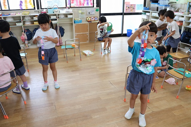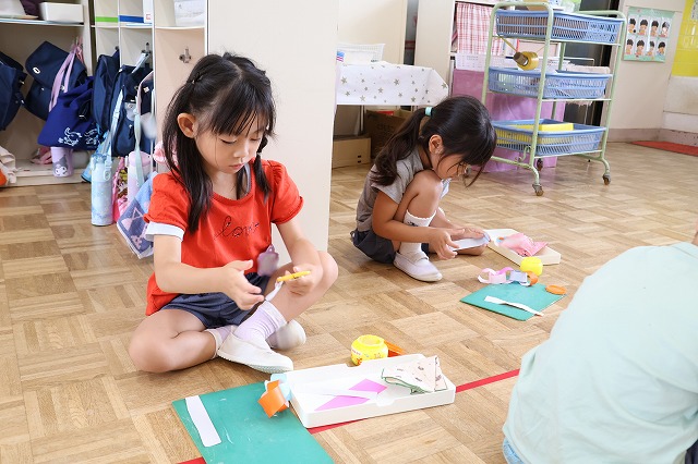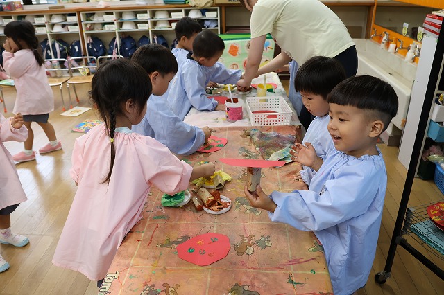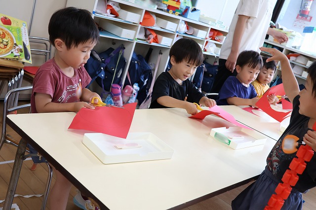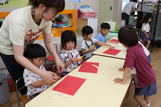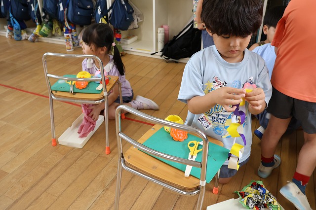 年中組さんは、輪つなぎや四角つなぎ、すいかなどを作りました。スイカを作ったときは、おいしそうで食べる真似をしている子もいましたよ♪