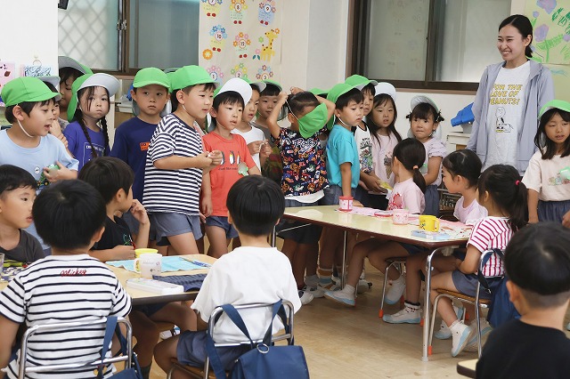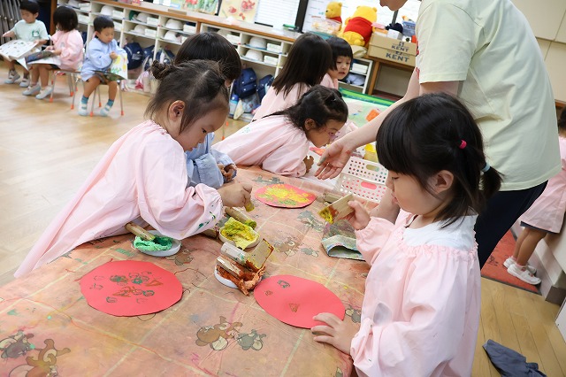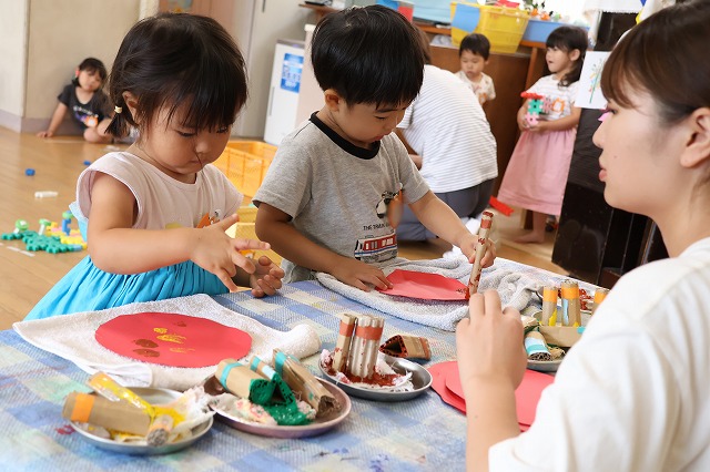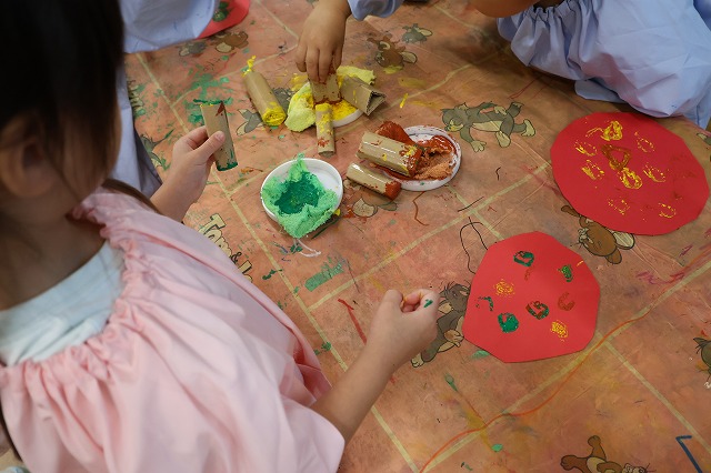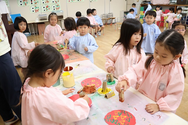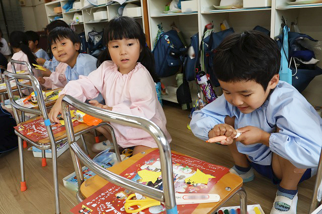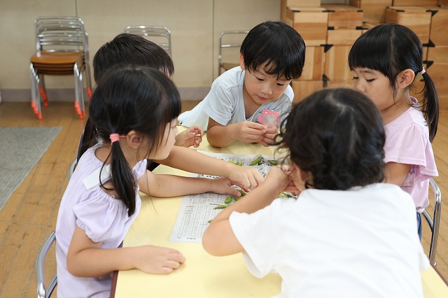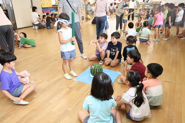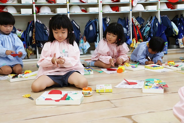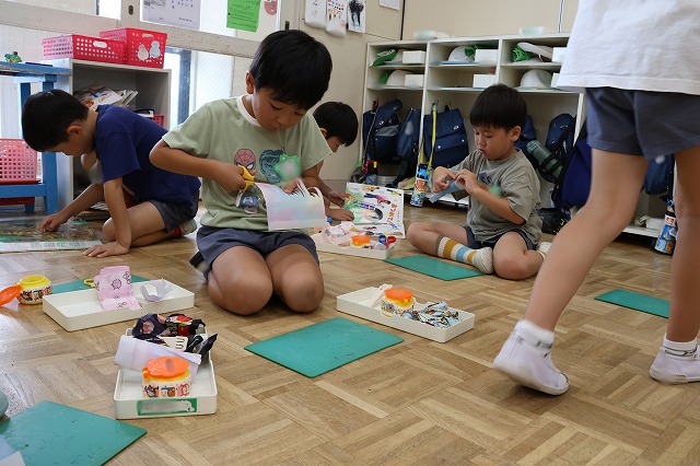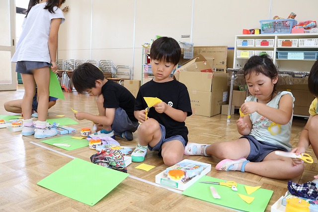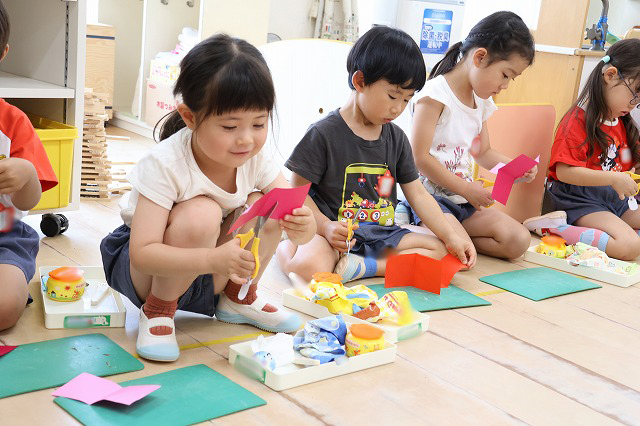 年中組さんは、輪つなぎや四角つなぎ、すいかなどを作りました。スイカを作ったときは、おいしそうで食べる真似をしている子もいましたよ♪