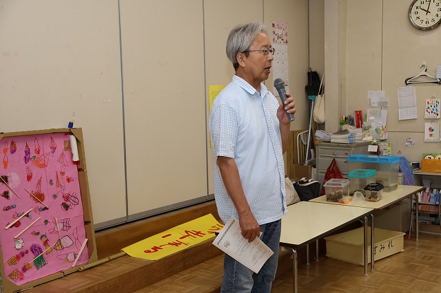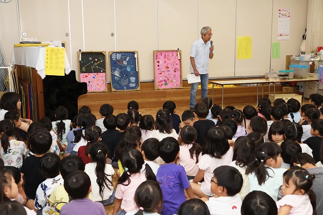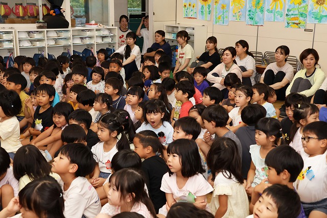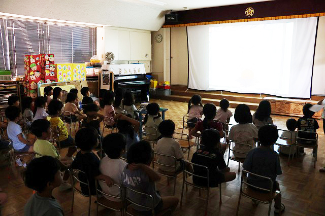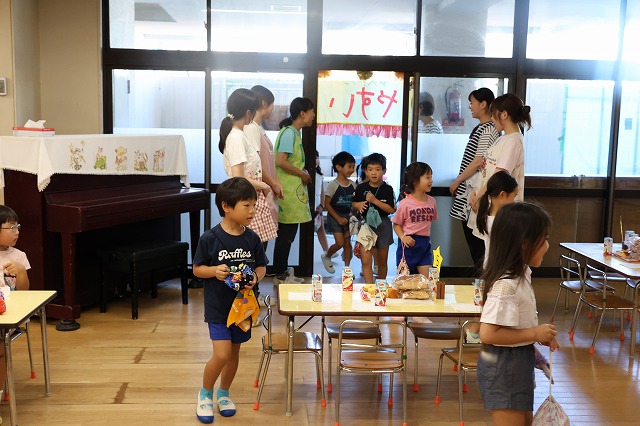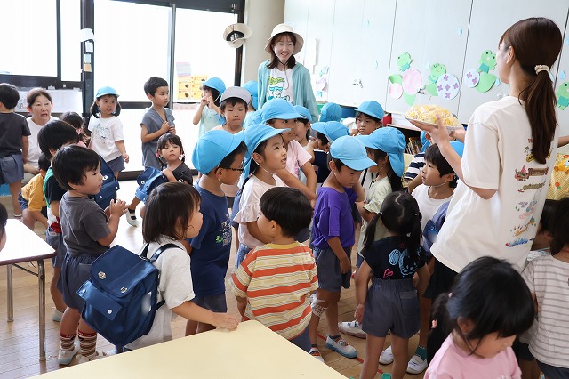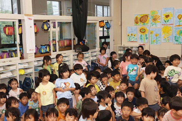 終業式は、みんな2階の部屋に集まって園長先生と夏休みのお約束をしました。