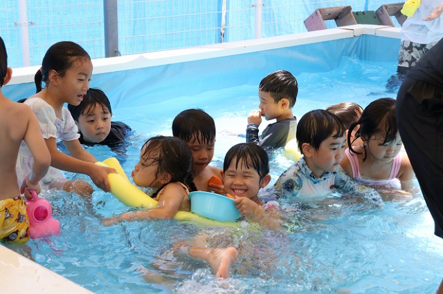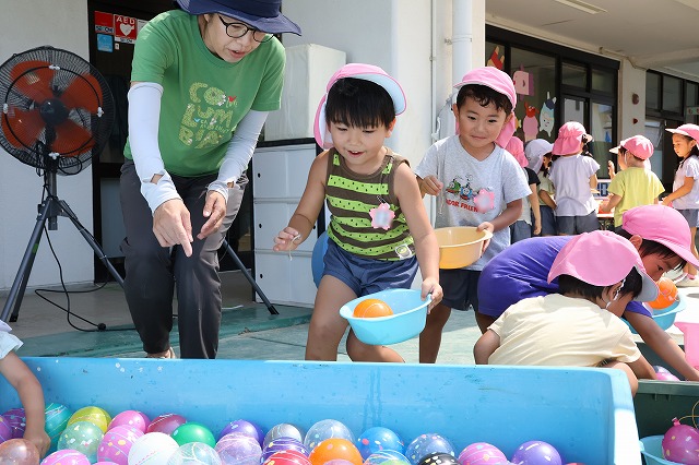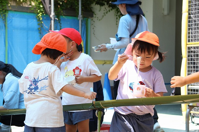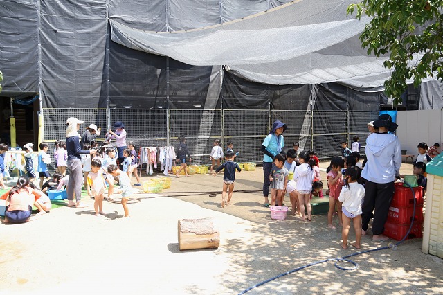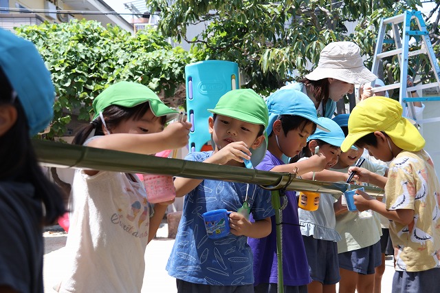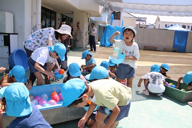 プールに入ったり、水風船や流しそうめんごっこ・的あて・水でっぽうなどなど少しずつ内容を変えながら水遊びをほぼ毎日のように行って、夏ならではの遊びや少しでも涼しさを感じられるようにしています。