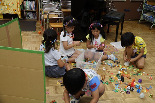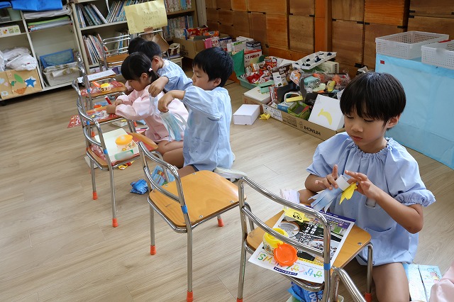 織姫と彦星のお話を聞いて、きれいな七夕飾りをお空から見てもらおうと、丁寧に折り紙を切ったり、のりで貼り合わせたりとみんな真剣に取り組んでいました♪