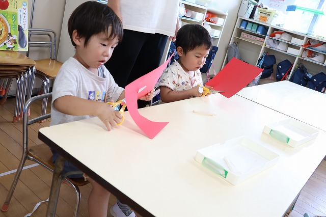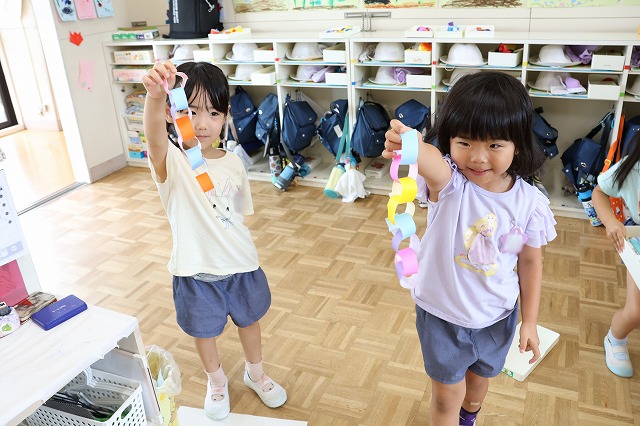 出来上がった笹飾りをお友達と見せあったり、先生に「見てー!できた!」と嬉しそうに見せにいったり、自分の好きな色で作った特別な笹飾りを喜んでいました☆