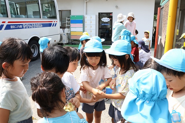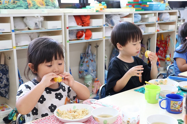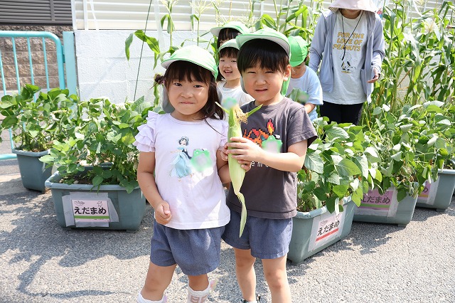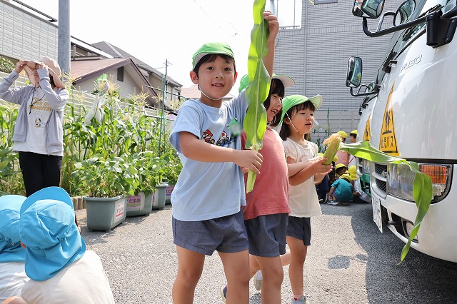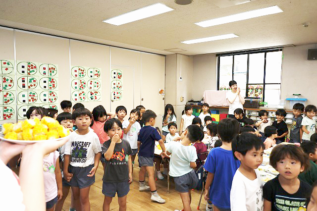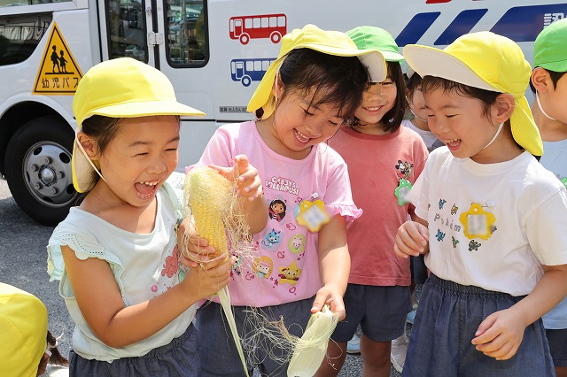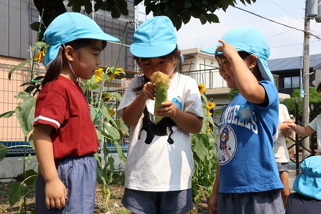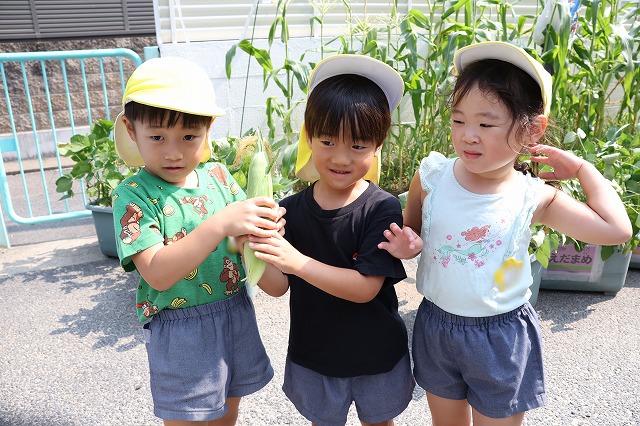年少組さんは大きい組さんがくれたとうもろこしを喜んで食べていました。