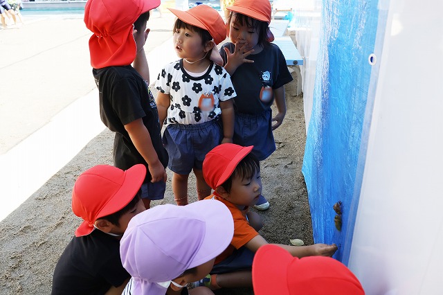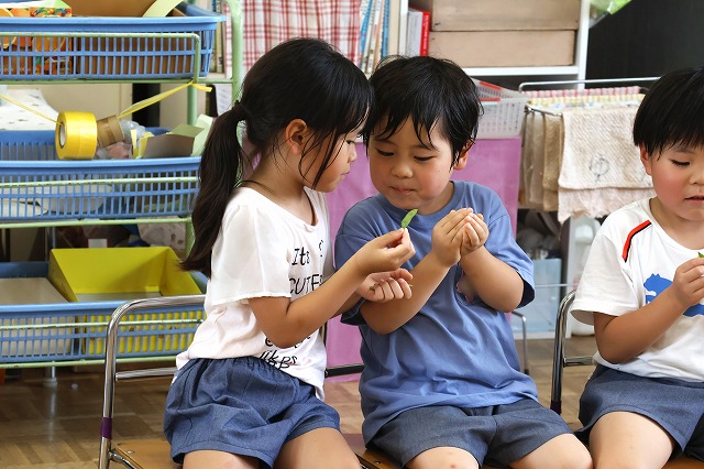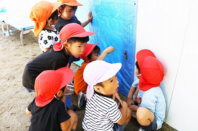 気が付いたのは、年中組さん。蝉の幼虫が殻を破って出てくる様子は、先生も本などでしか見たことがなかったので、先生もびっくり。子ども達は、初めて見る光景に不思議そうで「2個になった~!」「動いてる!」としばらくじーーーっと見ていました。