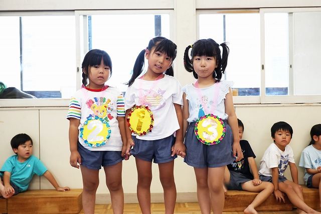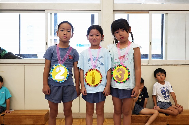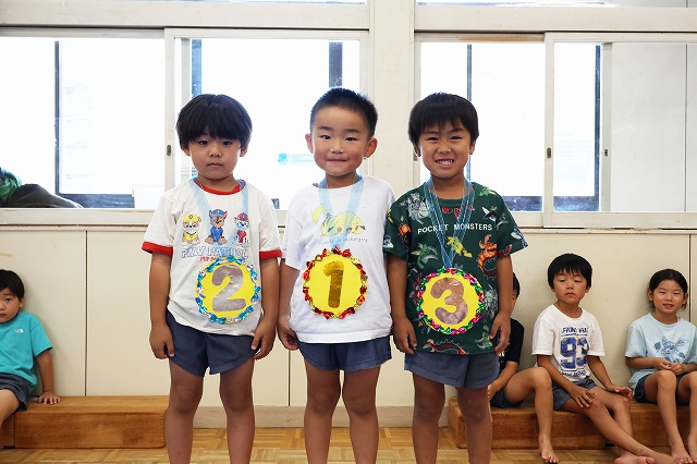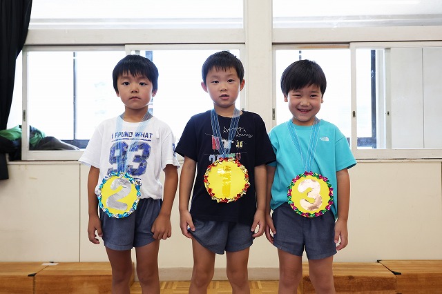 メダルをもらった子も満足そうにしている子や1位になれなくてちょっぴり悔しそうな表情の子もいましたが、園長先生から「おめでとう」の言葉をかけてもらって嬉しそうでした。