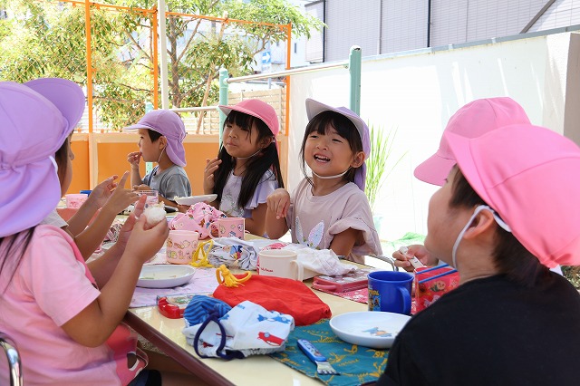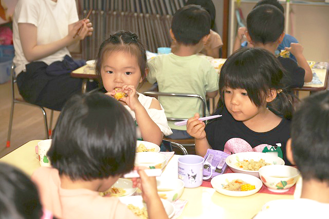 「おいし~」「3つもはいってたよ」とお話しながら食べる子。