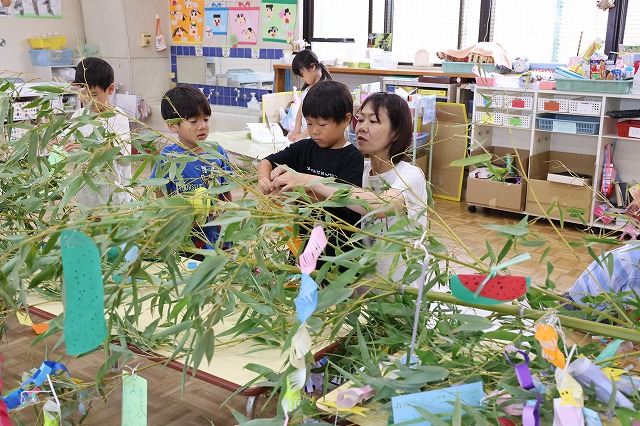 もちろん願い事も考えました。年少組さんや年中組さんは、先生に描いてもらいました。年長組さんは、先生に教えてもらったり一緒に描いてもらったりしながらかいていました。