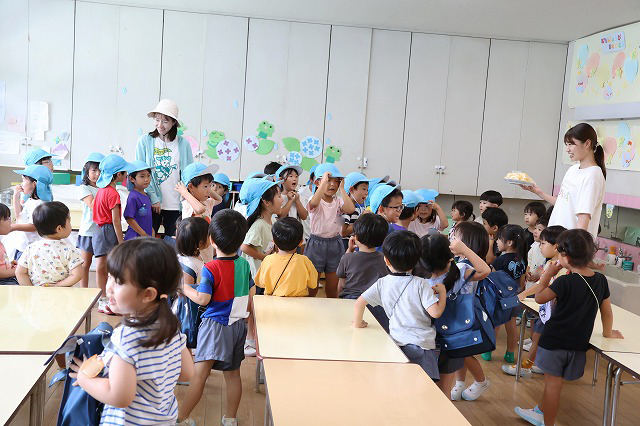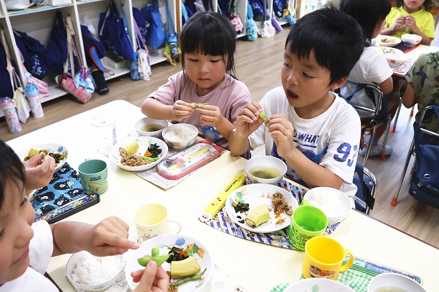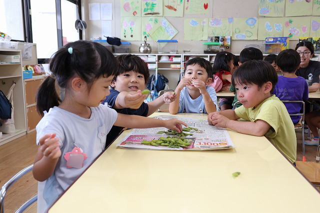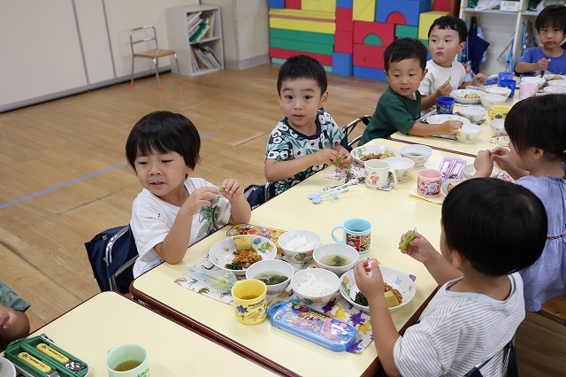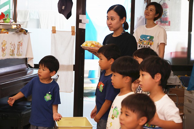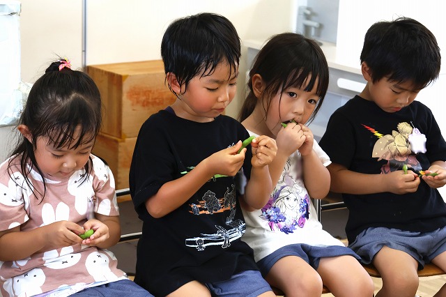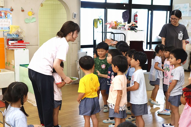 そして、今回は外遊びの時にお水やりを手伝ってくれた年少組さんにもおすそ分け。給食の時に一緒に頂きました。 年少組さんも好きな子は多く、おいしかったようです。