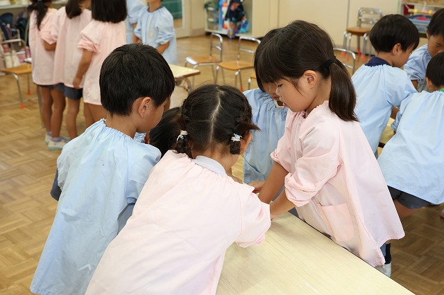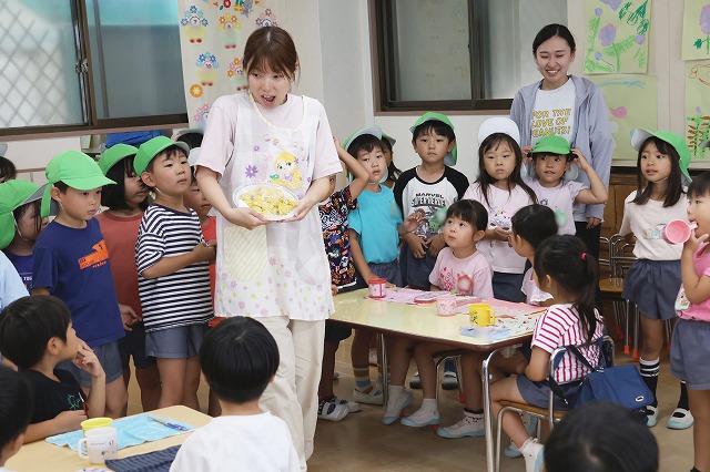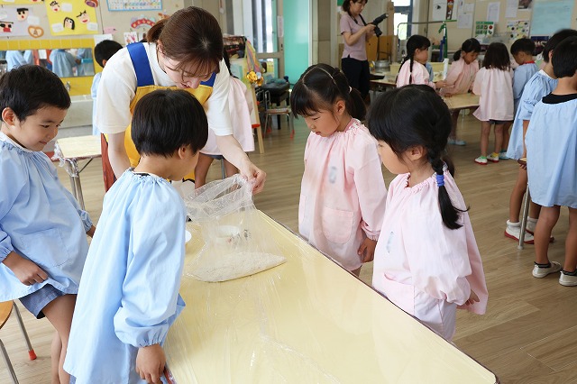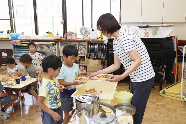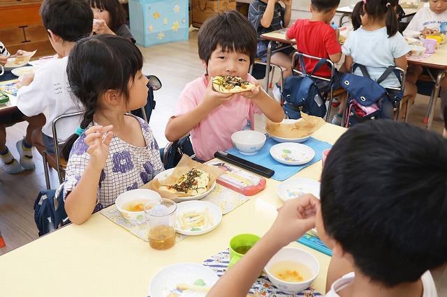 すみれ組さんは最後にのりをパラパラふりかけて仕上げました。「アツアツだね~」「美味しすぎ~」「チーズがのびた~」笑顔とともにたくさんの感想が聞こえてきました。