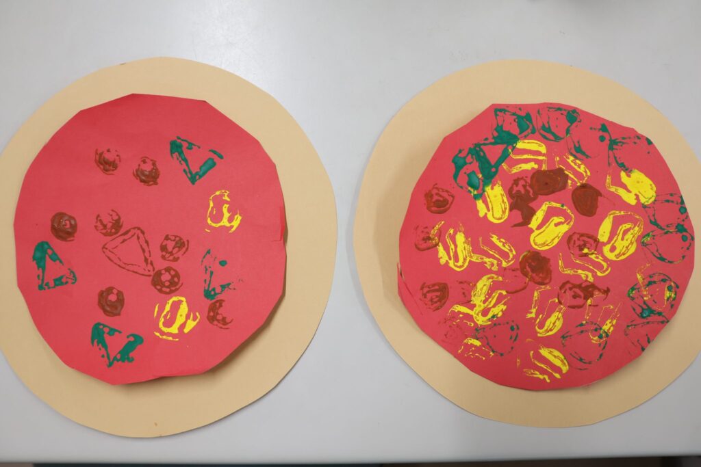 ピザが完成すると「みてみてー!」「トマトいっぱいにした!」と先生やお友達に嬉しそうに見せながら、嬉しそうに作っていました。