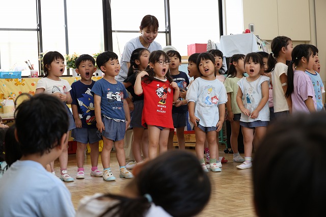 今月は、七夕の日も近いので最初にみんなで「たなばたさま」の歌をみんなで歌って誕生日会の始まりです♪