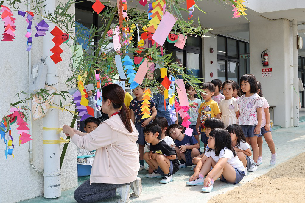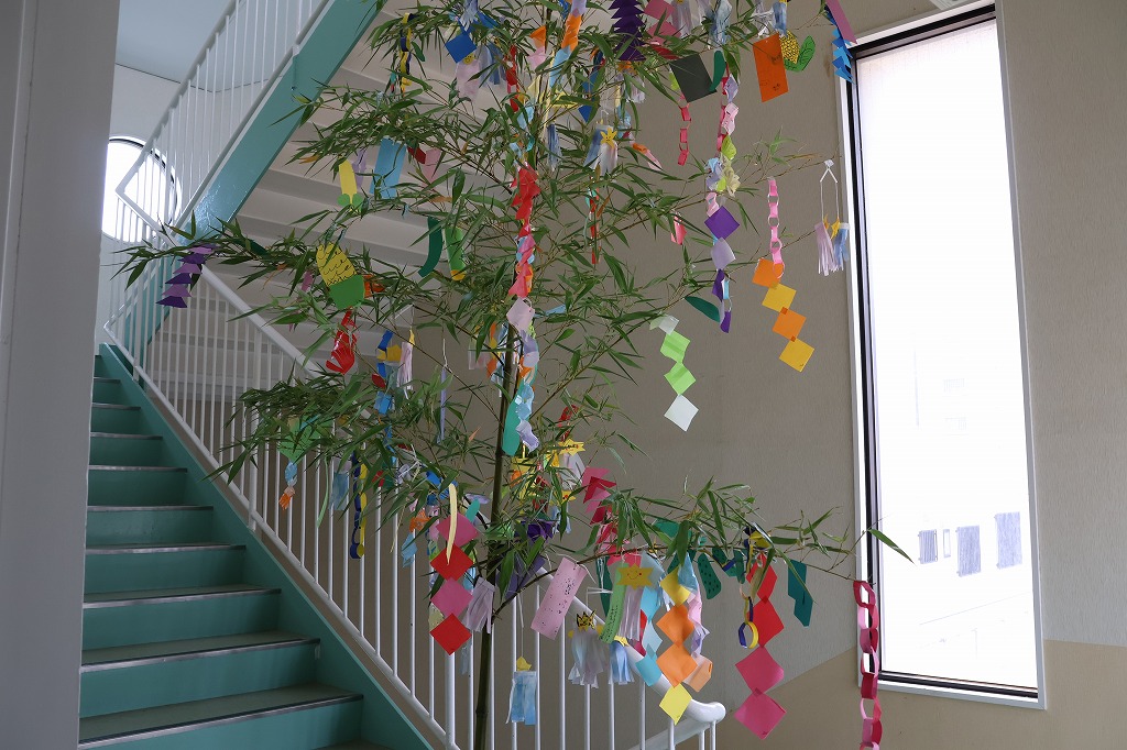 7月2日(水) 幼稚園に届いた立派な笹。翌日、担任の先生がお部屋に運び、それぞれに製作したものが園庭に飾られました!!とってもきれいです!!
