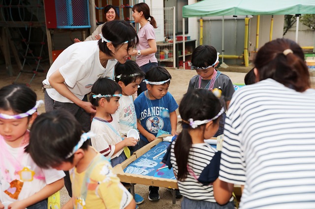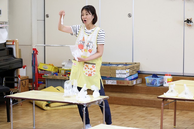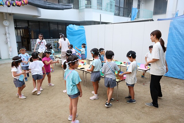 お母さん先生のヨーヨーつり屋さんで洗面器とつり用のひもをもらって、いざ開始!中には、初めてヨーヨーつりを経験する子もいましたが、先生と一緒にしてみたり、経験を繰り返すうちにだんだん上手に釣れるようになりました。