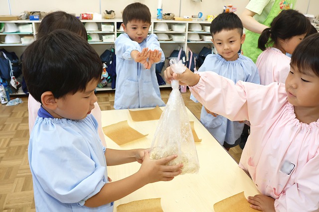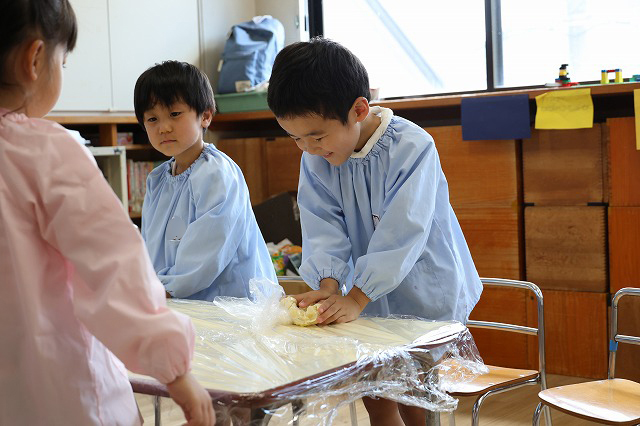 生地をまぜる時は…順番に混ぜるグループみんなで一緒にこねるグループなどそれぞれに考えながら作っていましたよ(^▽^)/