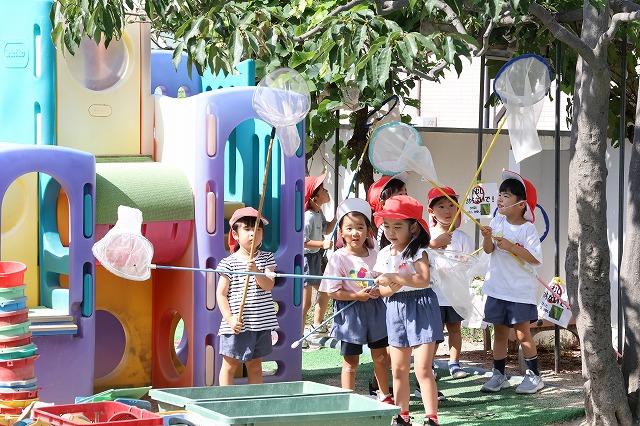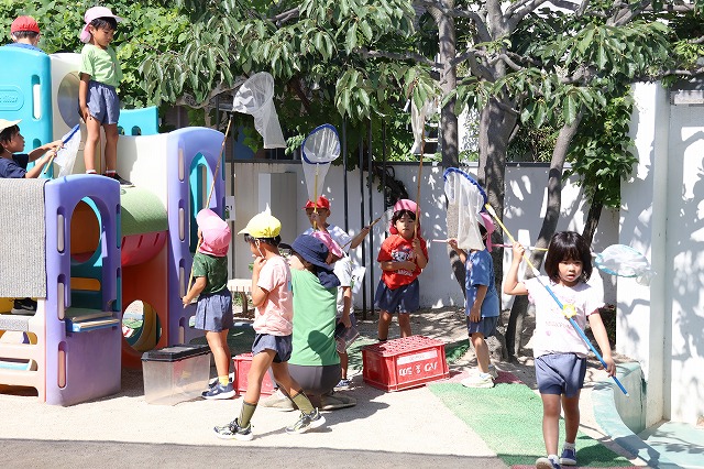 夏期保育では、プール遊びや水でっぽう、どろんこ遊びなどお水遊びを存分に楽しむほかに、夏ならではの蝉取りも存分にたのしみました。