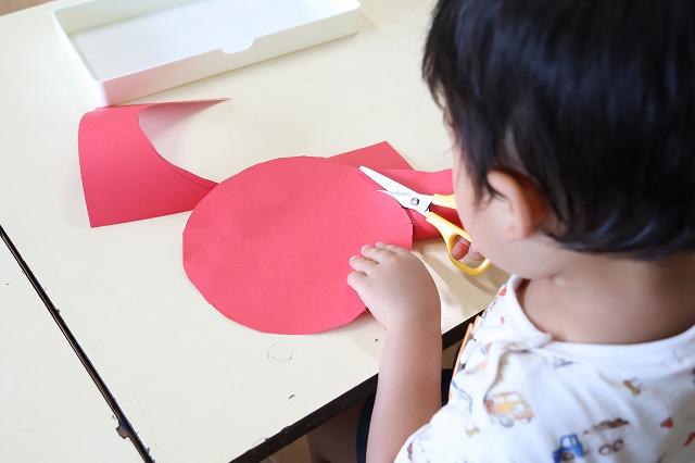 まずはピザ生地に塗るトマトソースをハサミで丸く切ります。先生に見守られながら、ハサミを正しく持って慎重に切り進めていきます。今まで何回もチャレンジしてきたハサミ。どんどん上達しています!