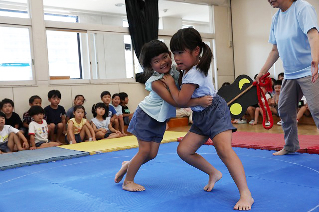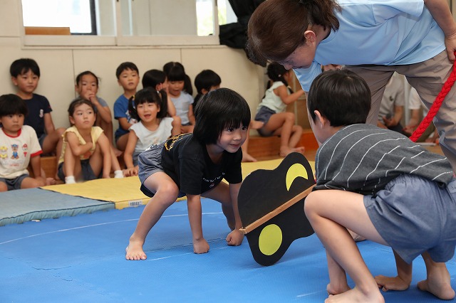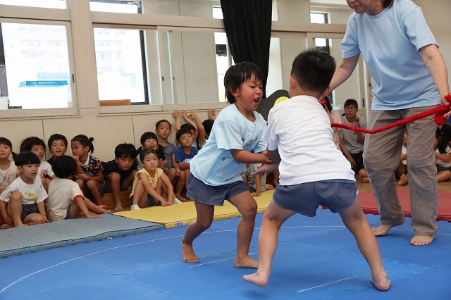 年中さん・年長さんの各クラスお部屋で勝負をし、勝ち抜いて代表になった子が戦います。年少さんはお部屋でおすもうごっこを楽しみ、ここでは応援隊になって参加しました。