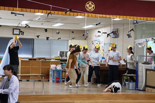 先生たちによる七夕の人劇。年少組の先生が織姫。年中組さんの先生が彦星。年少組の先生が牛さん。大王はお兄ちゃん先生です。他の先生は、お星さまです。