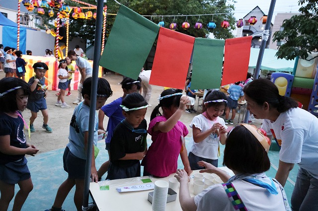 お祭りの音楽が流れる中、お客さんとお店の人に分かれて楽しみました。
