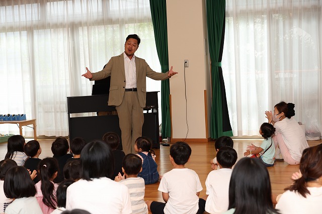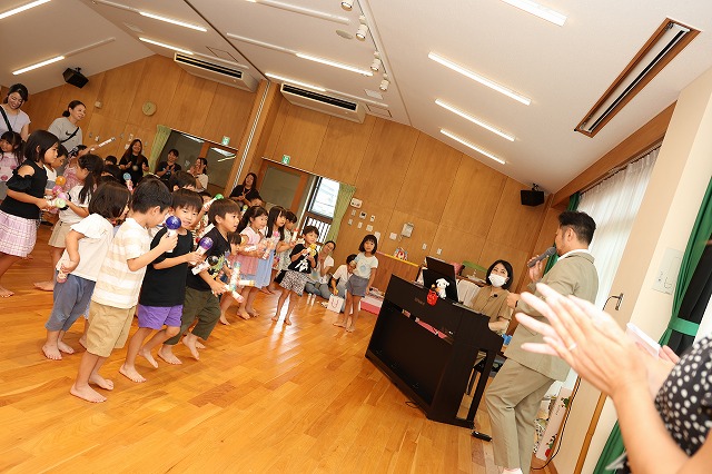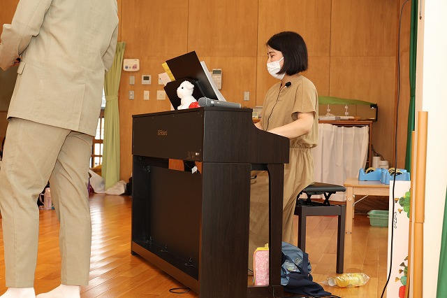 先日、保護者会主催の『親子で楽しむピアノコンサート&マラカス工作』が行われました。保護者の方に講師をしていただき、歌のお兄さんもお招きしてコンサートが始まりました♪