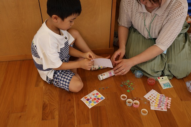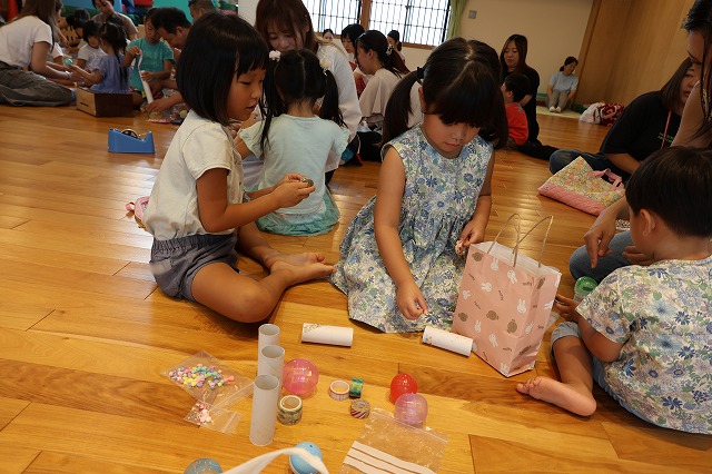 その後はみんな楽しみにしていたマラカス作り!それぞれ持って来た材料でお家の人とオリジナルのマラカスを作りました。完成したマラカスを振ってみると“シャンシャン”と素敵な音が♪嬉しそうにお家の方やお友達とならしている姿が見られました。