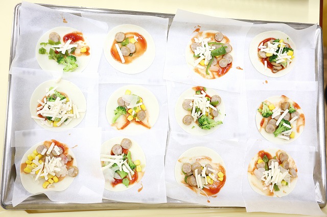 (チーズは豆乳でできたものなので、アレルギーの子も一緒に出来ました)給食室で焼いてもらうと・・皮がパリッパリになっておいしそう♪