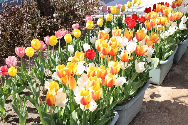 今幼稚園の北のお庭には、12月に年少組さんと年中組さんが植えてくれたたくさんのチューリップが満開に咲いています♪