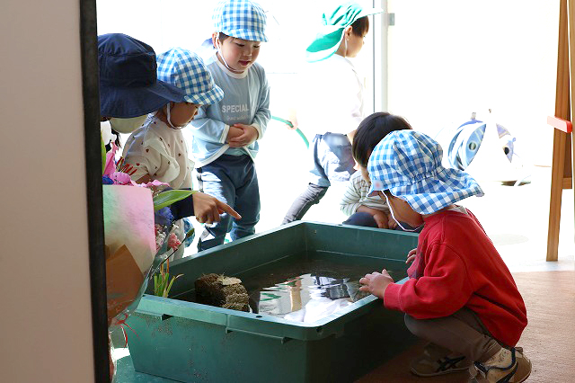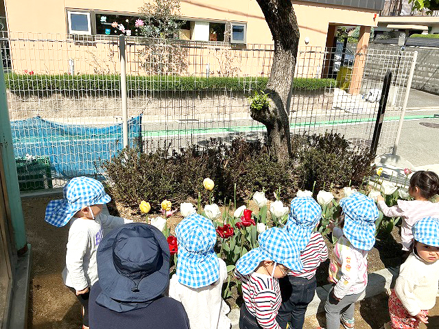 また、先日はチューリップのお歌が大好きなぶどう組さんが、北のお庭にチューリップを見に行き、お花にお歌を聞かせてあげました^_^