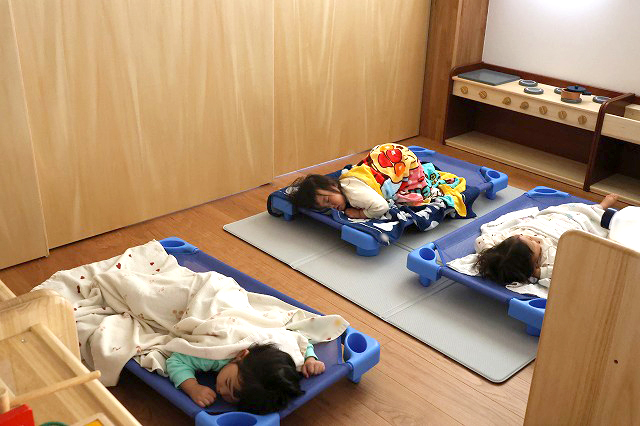 午睡もすぐに眠る子もいれば、なかなか寝付けない子もいて、先生に抱っこしてもらいながらゆったりとした時間を過ごしている子もいます。