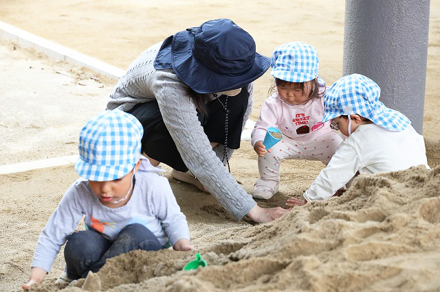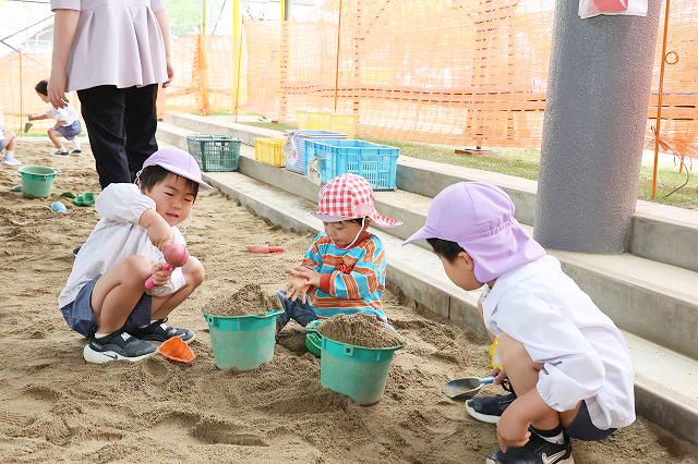 お外では、お砂遊びをしたり、遊具に登ってみたり、先生を追いかけたり・・・