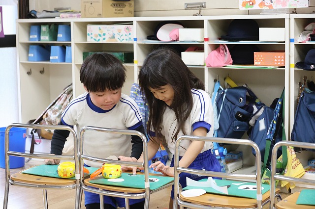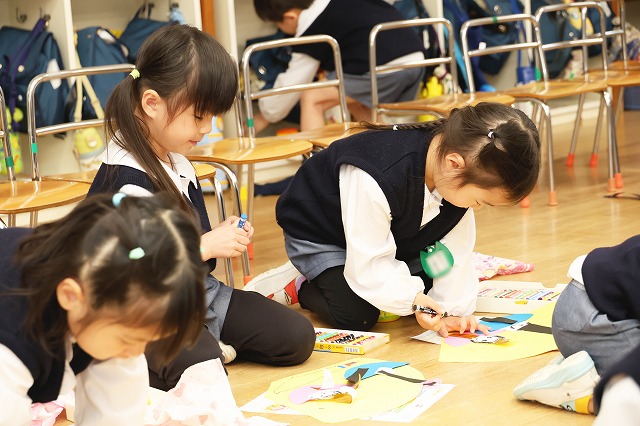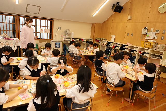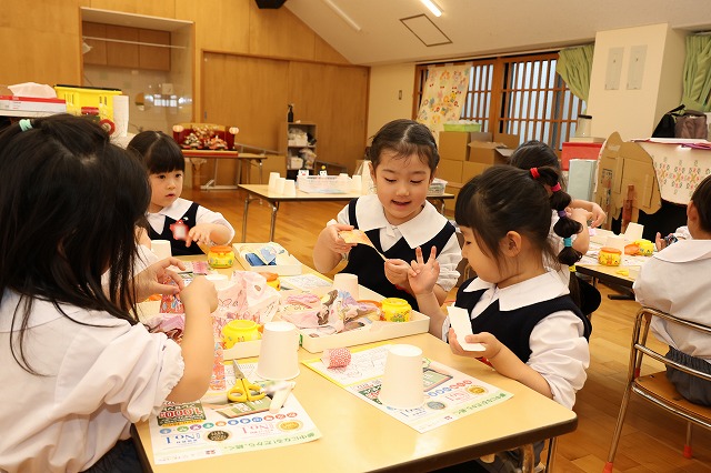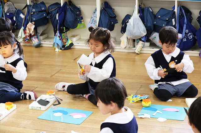 年少組さんと年中組さんは、おひなさまの製作も行いました。