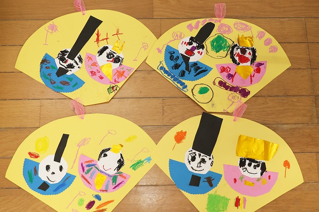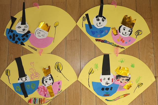 金色の紙で冠や扇などを作って、お雛様とお内裏様を作りました。