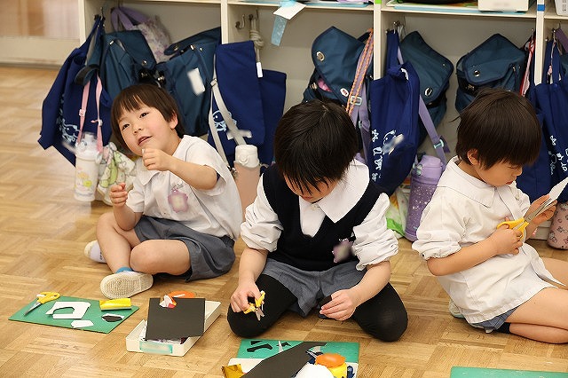 年少組さんは、お顔の丸が書いた紙を切って、髪の毛や飾りは自分で好きなように切りました。