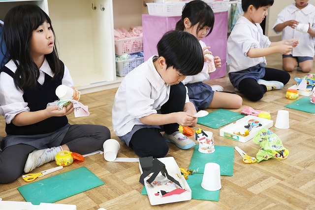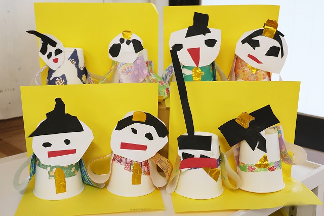年中組さんは、自分で顔や髪の毛、飾りなどを切って紙コップをお体にして作りました。お袖は、きれいな模様の千代紙をそれぞれ選んで作りました♪